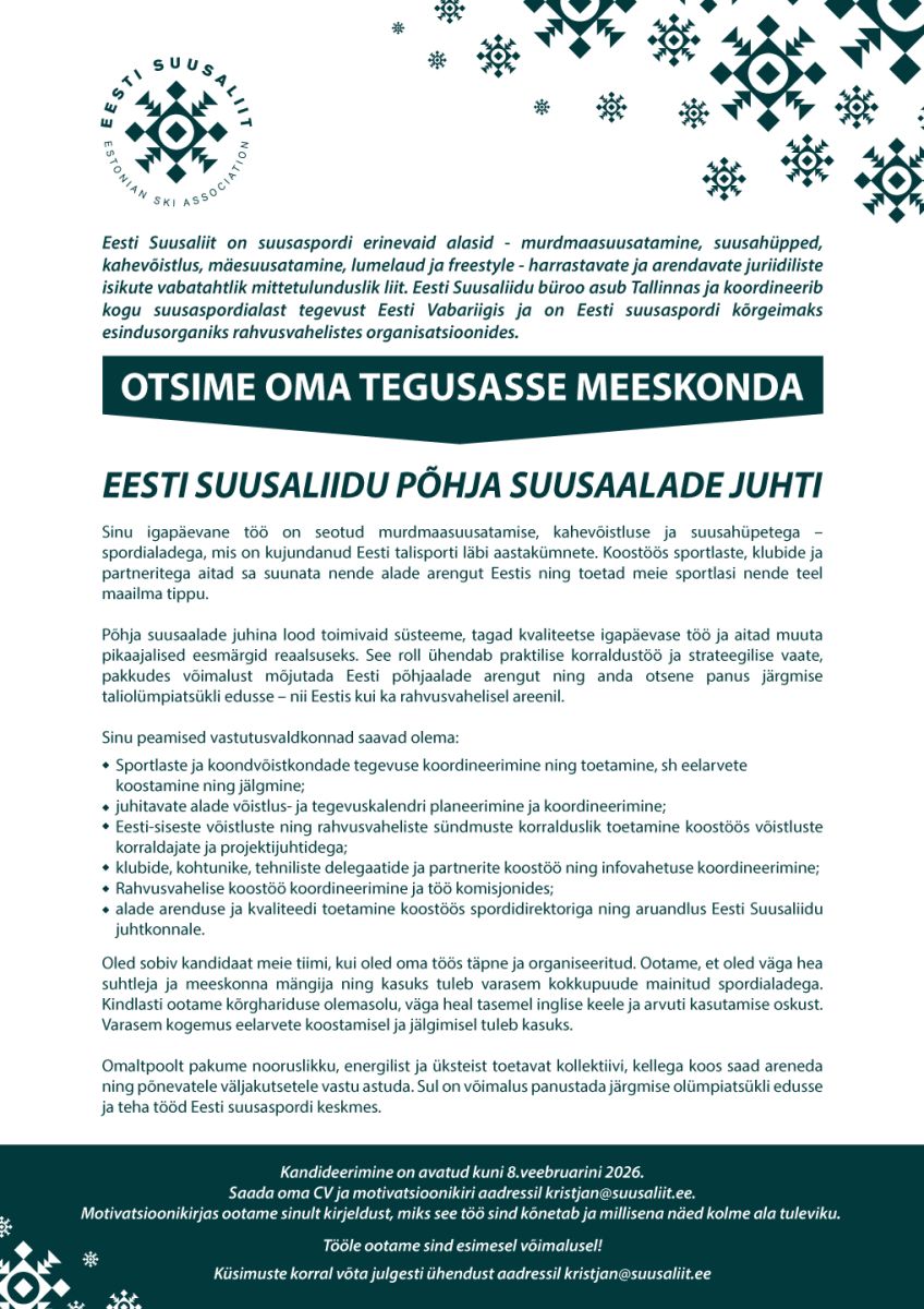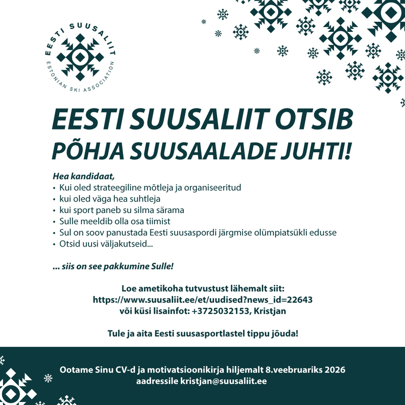 • CV ja motivatsioonikiri* saada palun kristjan@suusaliit.ee