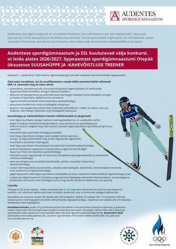 Audentese spordigümnaasium ja ESL kuulutavad välja konkursi, et leida alates 2026/2027. õppeaastast spordigümnaasiumi Otepää üksusesse SUUSAHÜPPE JA -KAHEVÕISTLUSE TREENER
