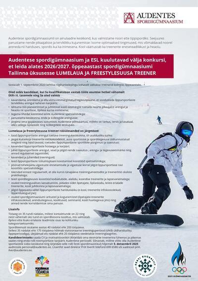 Audentese spordigümnaasium ja ESL kuulutavad välja konkursi, et leida alates 2026/2027. õppeaastast spordigümnaasiumi Tallinna üksusesse LUMELAUA JA FREESTYLESUUSA TREENER